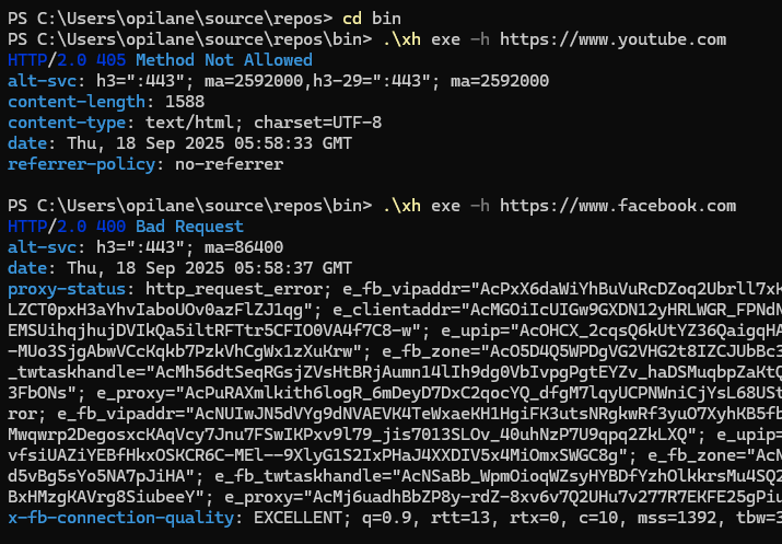 Meeskonnad teevad HEAD-päringuid YouTube’i ja Facebooki serveritele, et saada ainult HTTP-vastuse pealkirjad. See võimaldab kontrollida lehtede metaandmeid, nagu vastuse staatus, sisu tüüp ja muud parameetrid, ilma lehtede sisu alla laadimata.