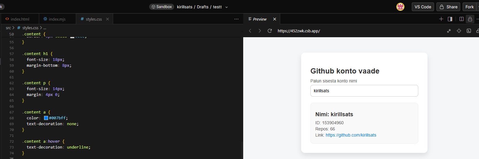 On loodud leht mis teeb päringu GitHubi ja näitab valiku infot (nimi, ID, repositooriumide arv, link profiilile).