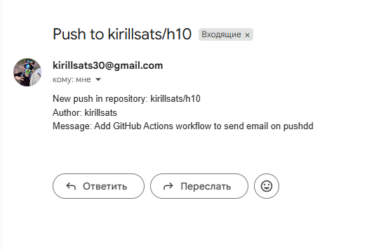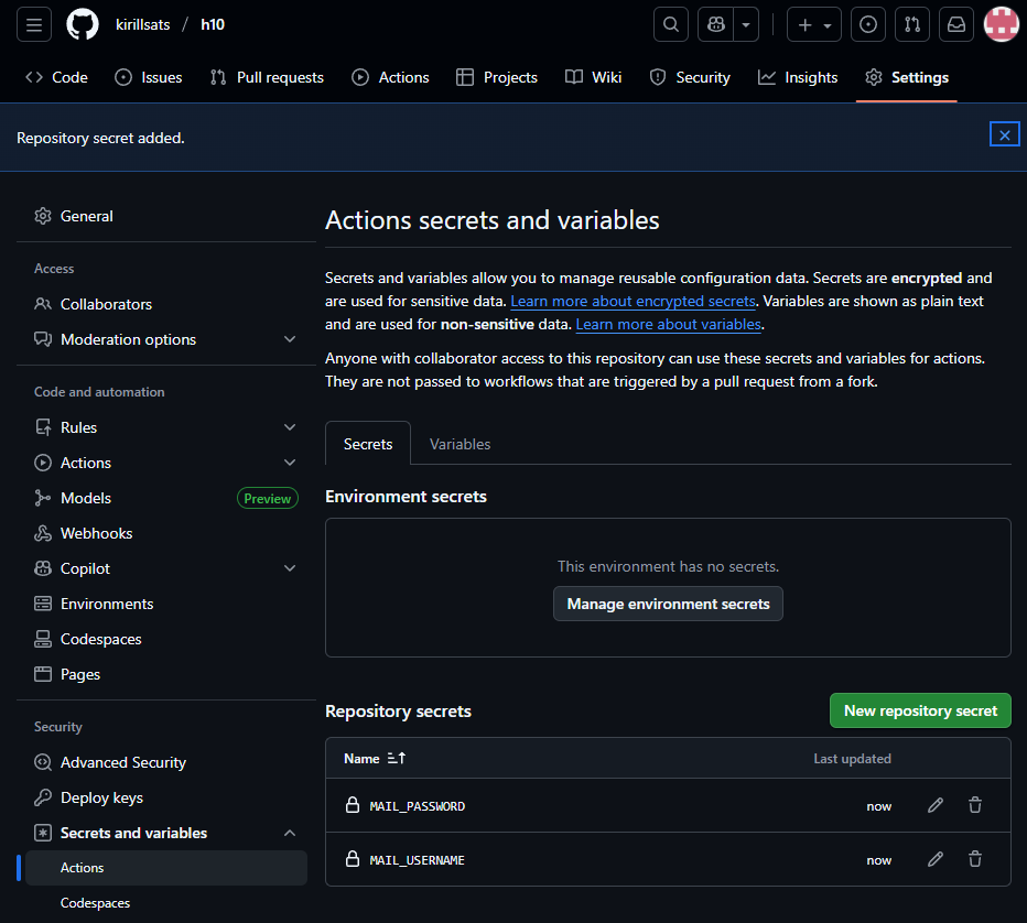 Message: ${{ github.event.head_commit.message }}5. Avame ja loome MAIL_USERNAME kuhu tee kirjutate oma gmail ja loome MAIL_PASSWORD sisse kirjutame 16 sümboli google account code link kust saab võtta